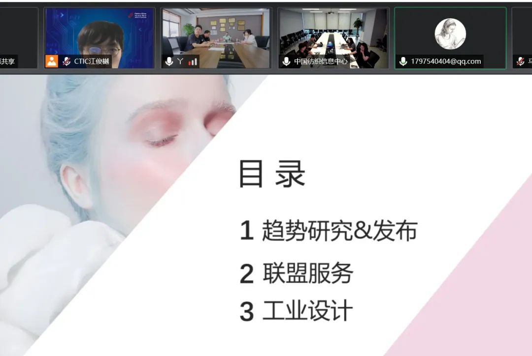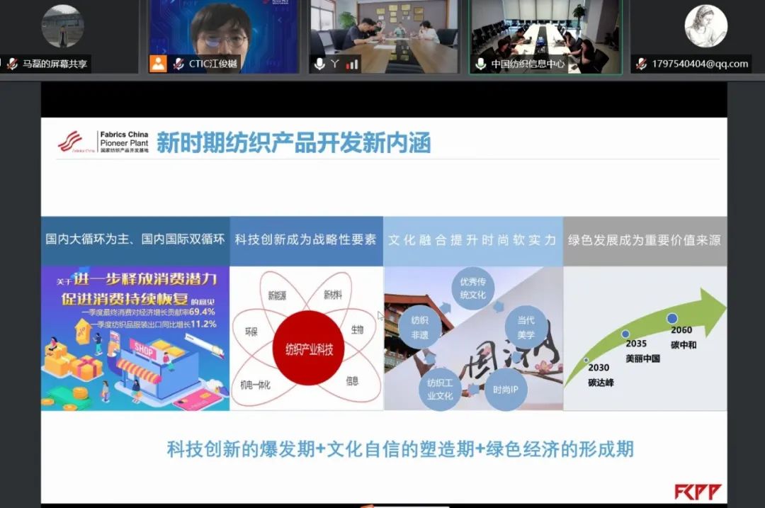 2022年5月31日下午,国家纺织产品开发基地秘书处委派中国纺织信息中心流行趋势部主任/中国流行色协会副会长齐梅、国家纺织产品开发基地秘书处秘书长/中国纺织信息中心产品开发部主任陈小丽、产品开发部副主任马磊、项目总监陈培培、市场经理江俊樾和项目经理李依璇组成评估组,对我司“国家再生纤维素纤维长丝提花产品开发基地”,进行了线上基地复评。